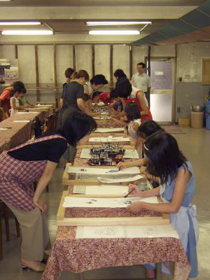 生地に塗り立ての色ではなく その発色した色の染め上がりを思いながら 染めるところが友禅の難しいところです。