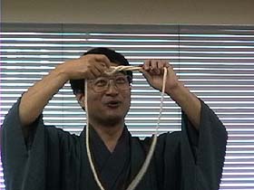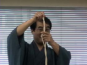 裂いた物を合わせて、撚って、撚った部分を寝かせて、また撚ってとめます。